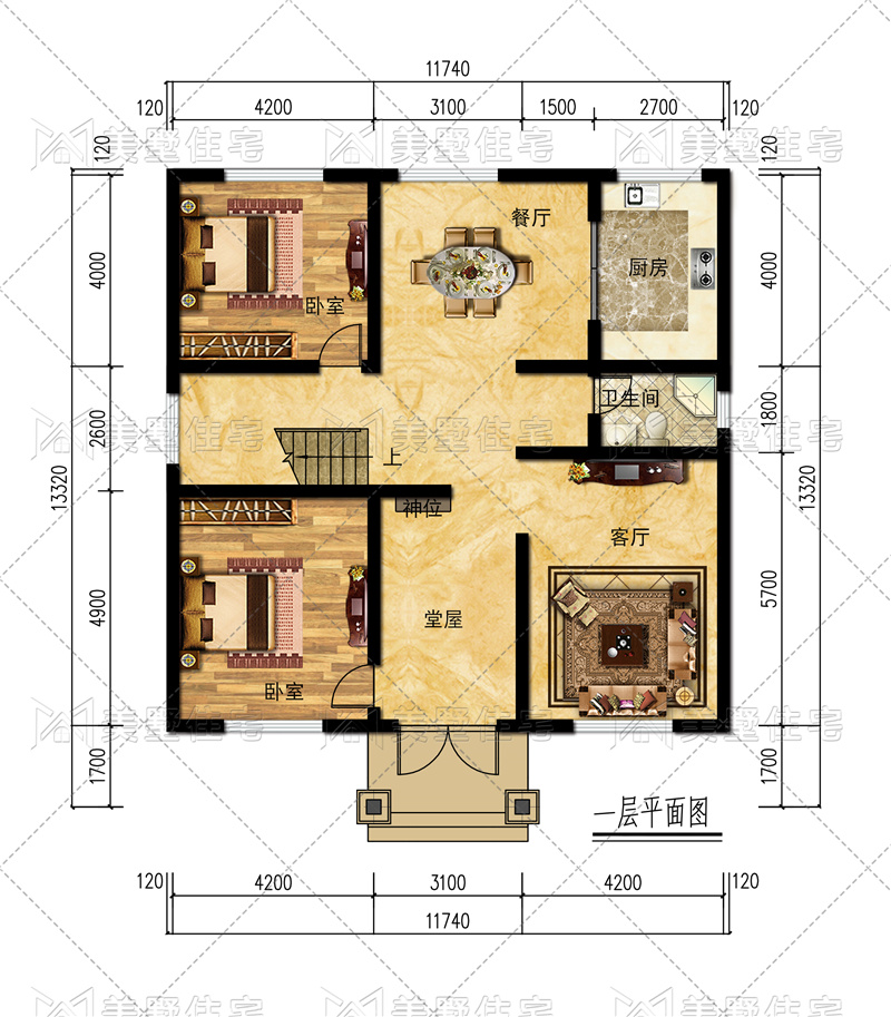 一层设有堂屋、神位、客厅、餐厅、厨房、卧室、卫生间。