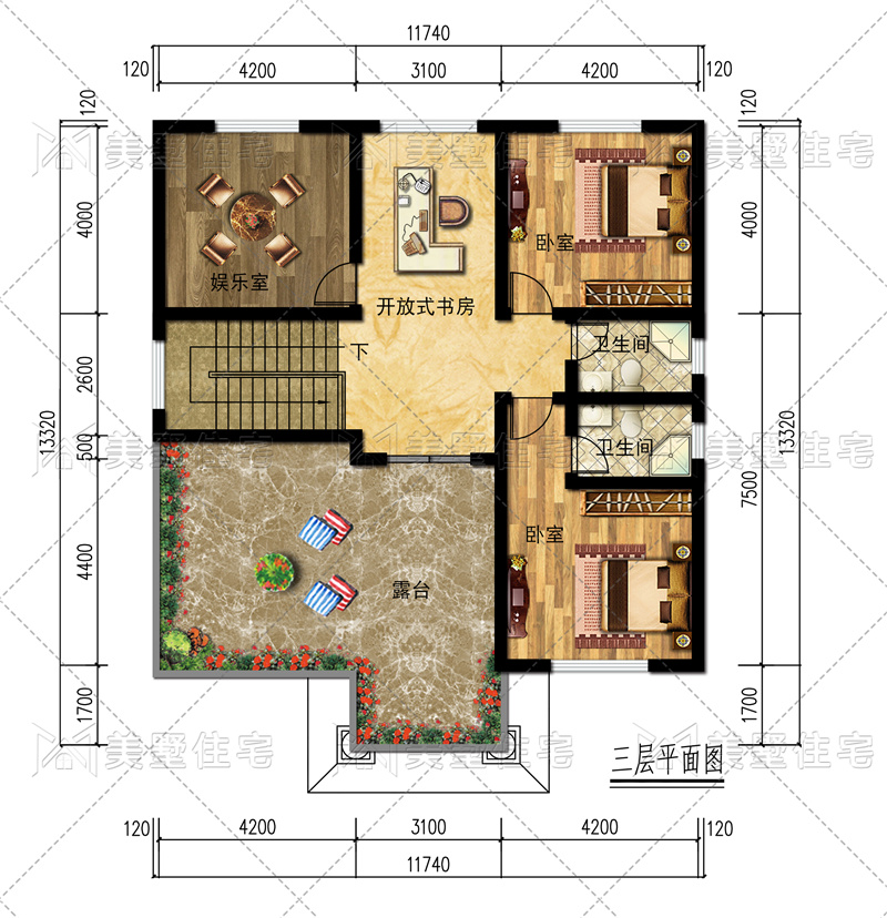 三层设有卧室、卫生间、开放式书房、娱乐室。