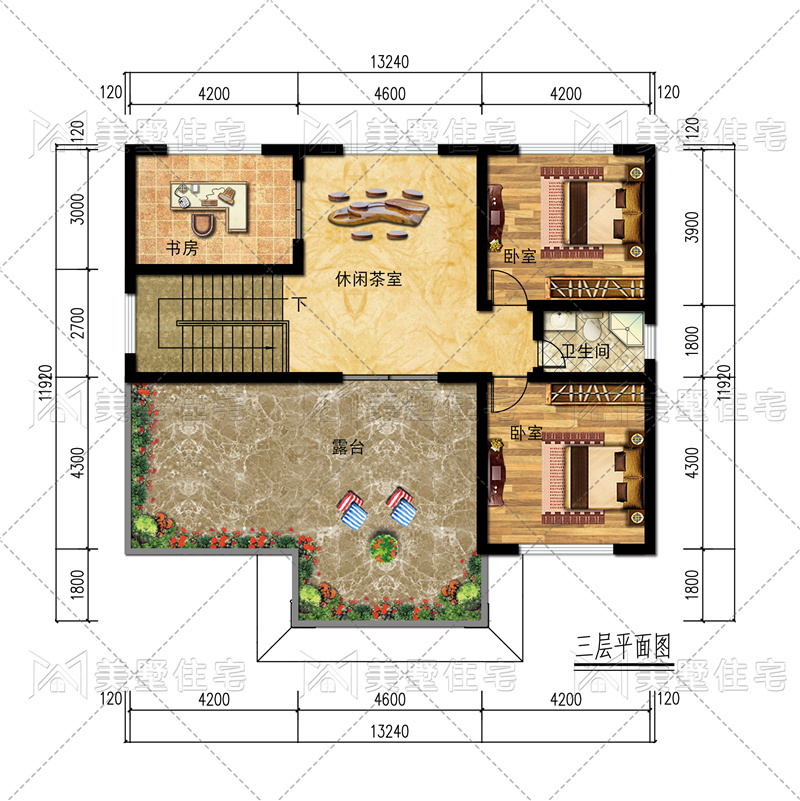 三层设有休闲茶室、书房、卧室、卫生间、露台。