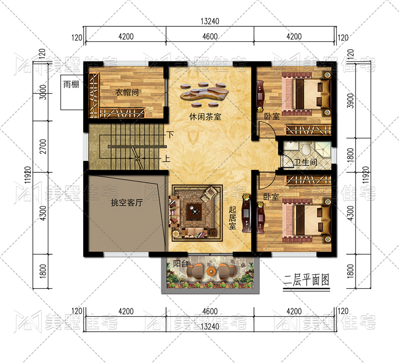 二层设有起居室、阳台、休闲茶室、卧室、卫生间、衣帽间。