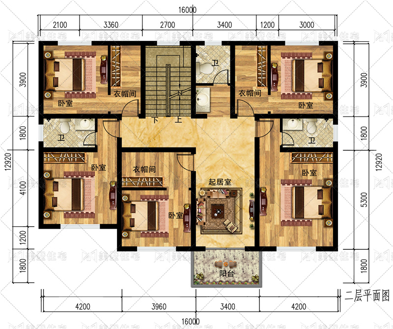 二层设有起居室、阳台、卧室、衣帽间、卫生间。