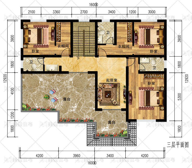 三层设有起居室、卧室、衣帽间、卫生间、露台。