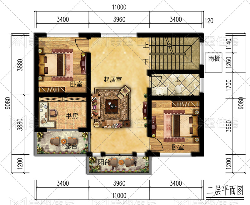 二层设有起居室、卧室、卫生间、书房、阳台。