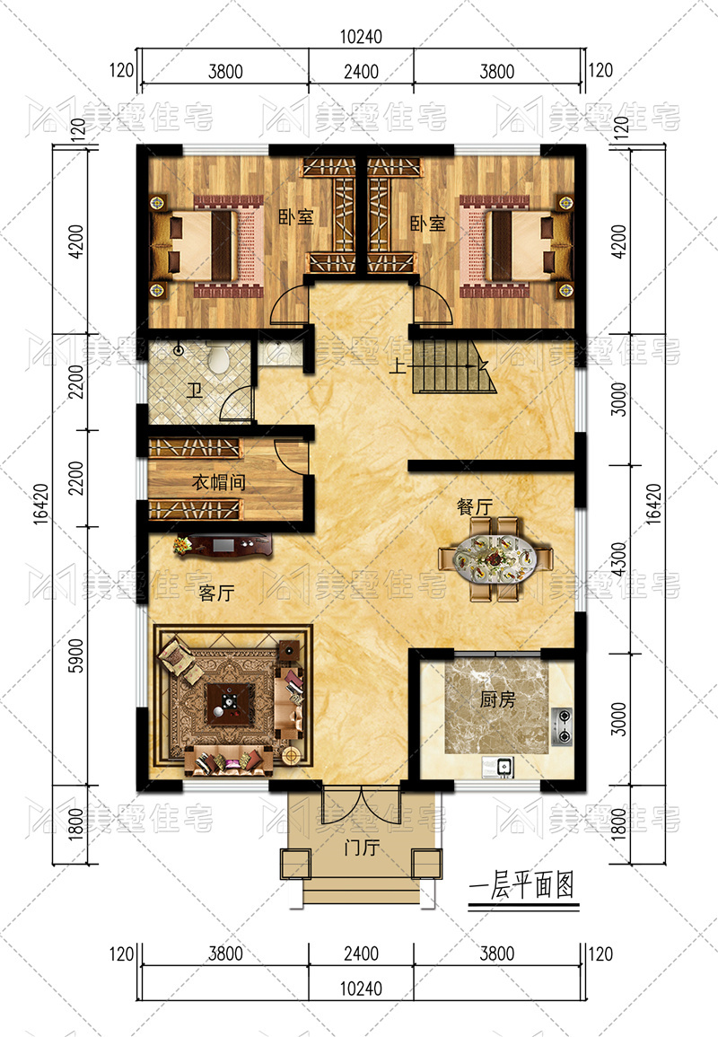 一层设有门厅、客厅、餐厅、厨房、衣帽间、卧室、卫生间。