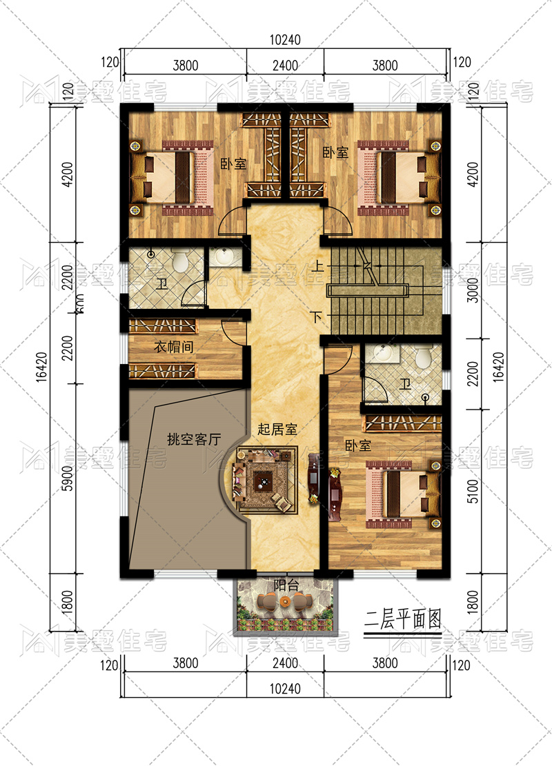 二层设有起居室、阳台、卧室、卫生间、衣帽间。