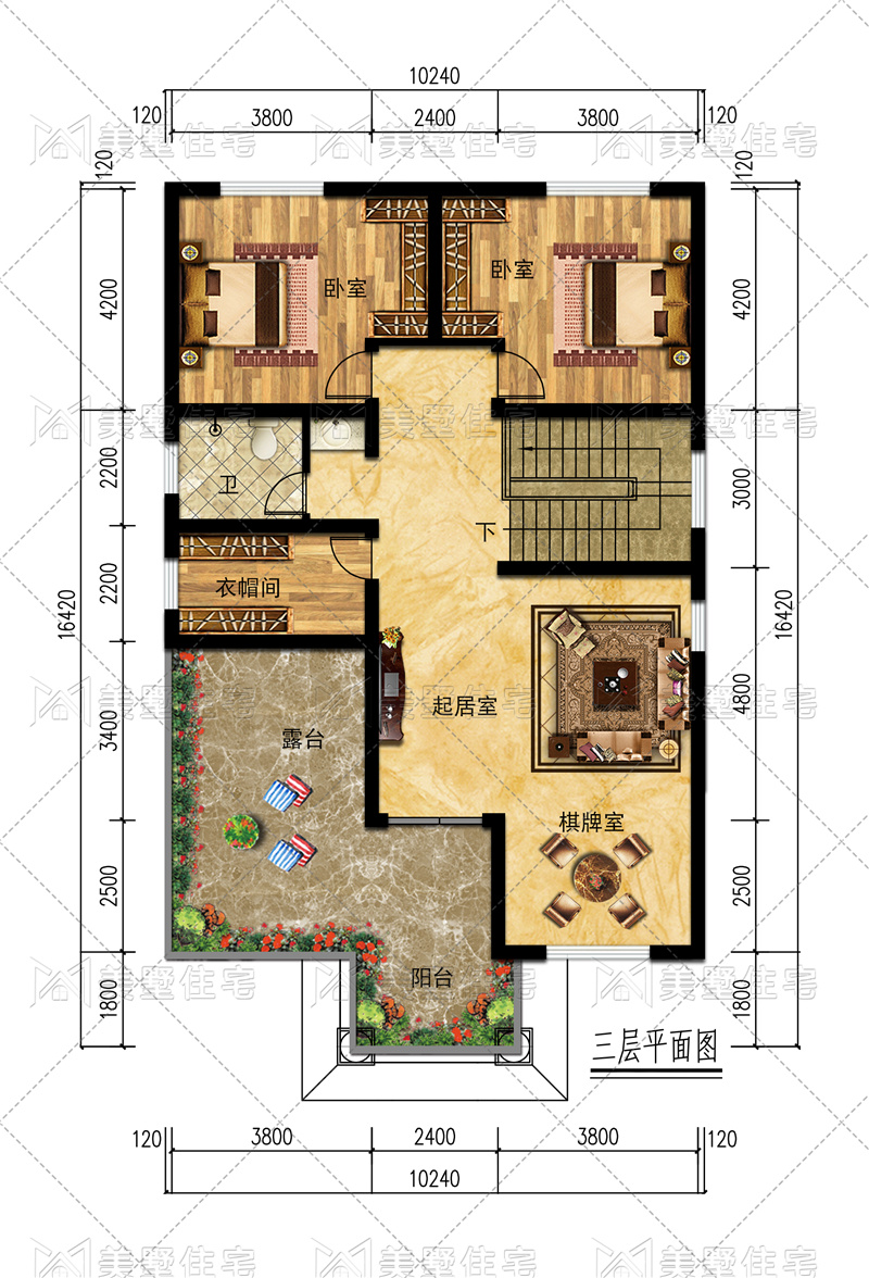 三层设有起居室、棋牌室、卧室、衣帽间、卫生间、露台、阳台。
