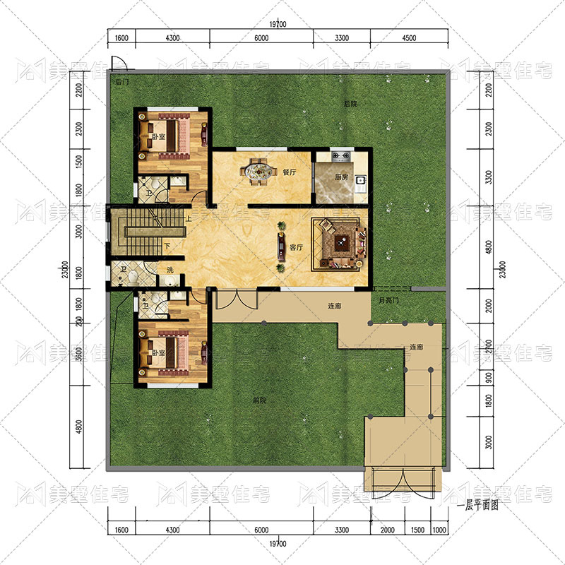 一层设有前院、连廊、月亮门、后院、后门、客厅、餐厅、厨房、卧室、卫生间。