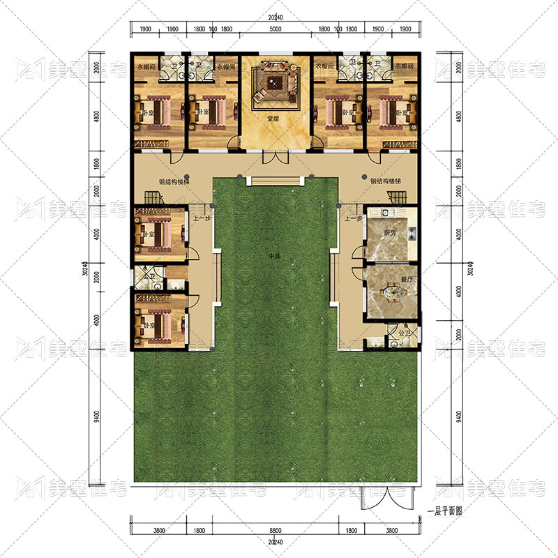 一层设有中庭、堂屋、餐厅、厨房、钢结构楼梯、卧室、衣帽间、卫生间。