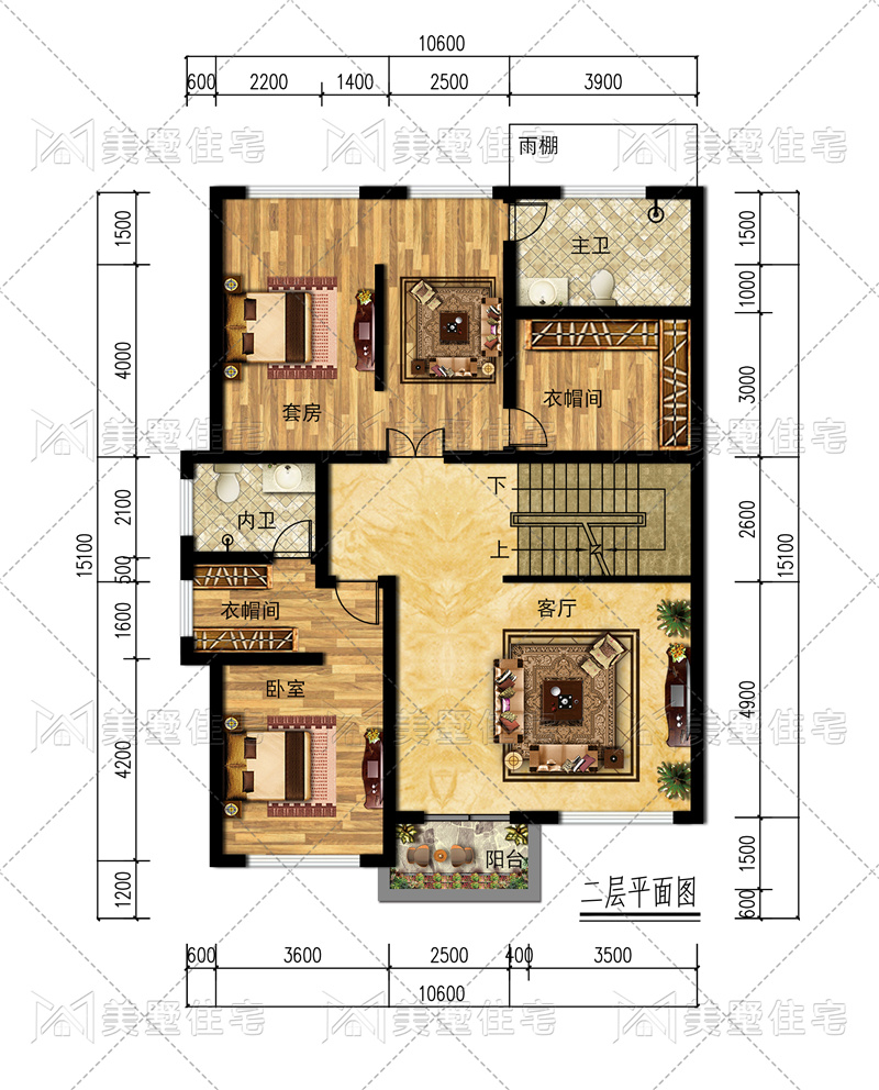 二层设有客厅、阳台、套房、衣帽间、主卫、内卫。