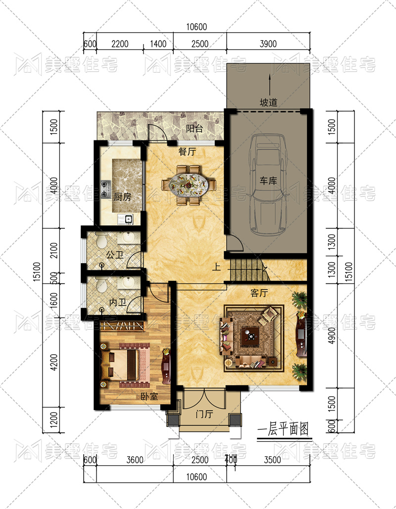 一层设有门厅、客厅、阳台、坡道、车库、餐厅、厨房、卧室、卫生间。