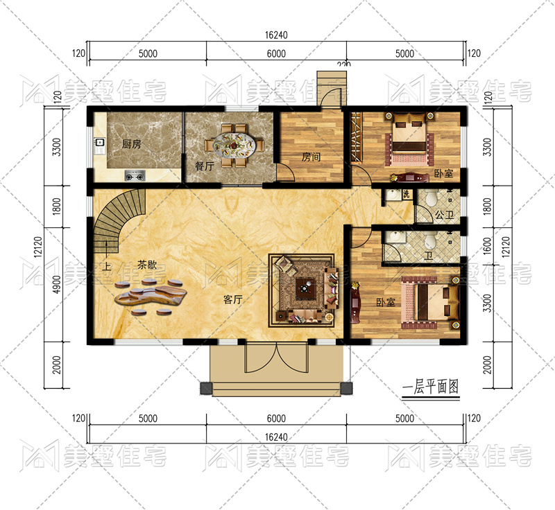 一层设有客厅、茶歇、卧室、卫生间、公卫、厨房、餐厅、房间。
