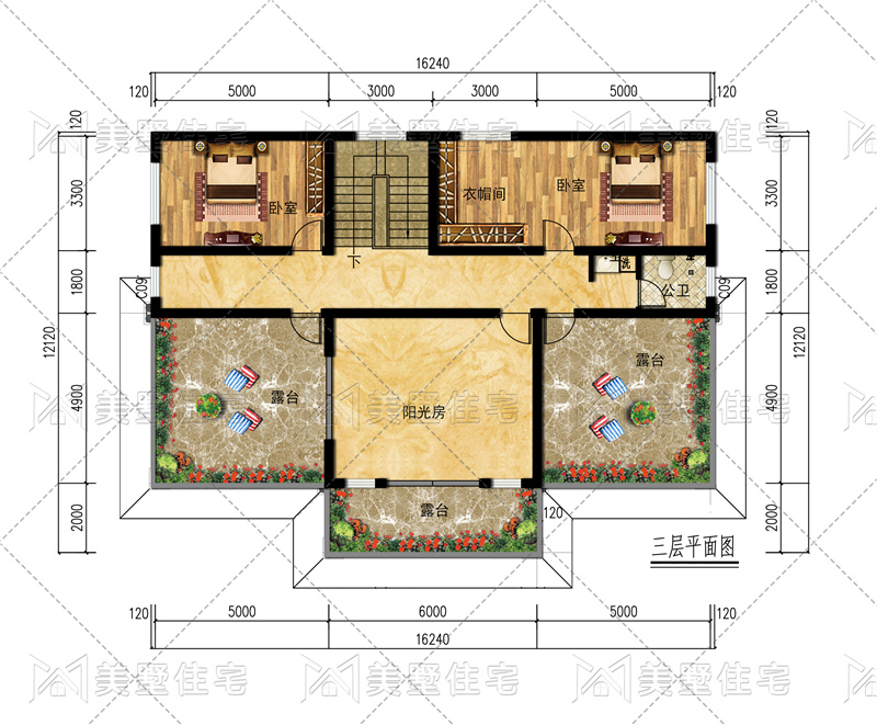 三层设有卧室、衣帽间、阳光房、露台、公卫。