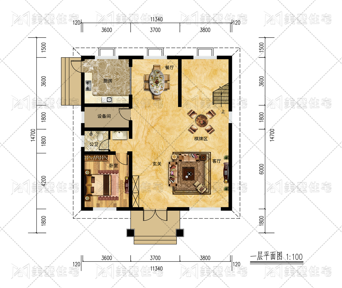一层设有客厅、棋牌区、餐厅、厨房、设备间、卧室、卫生间