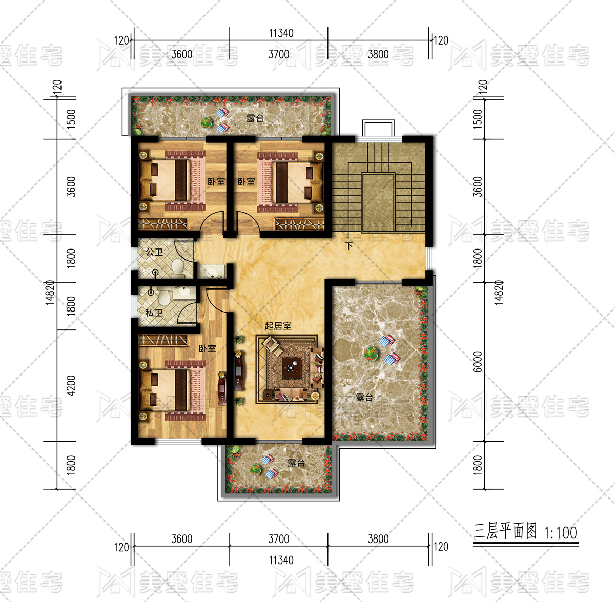 3间卧室+1间公卫,其中一间带内卫,满足更多的住宿需求,保证亲朋好友前来拜访的留宿需要。