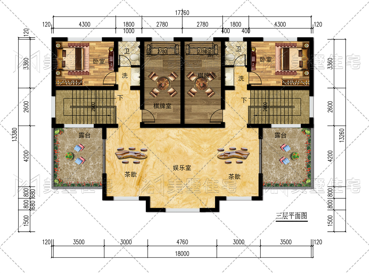三层设有露台、棋牌区、卧室、卫生间、茶歇、娱乐室