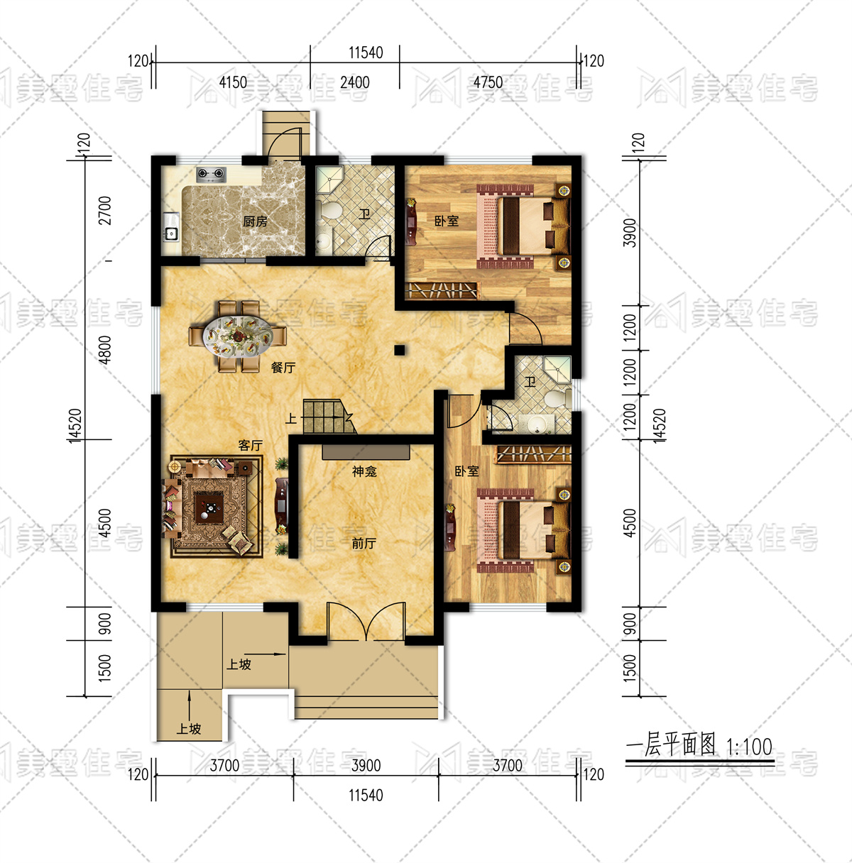 一层设有餐厅、厨房、卧室、卫生间、客厅
