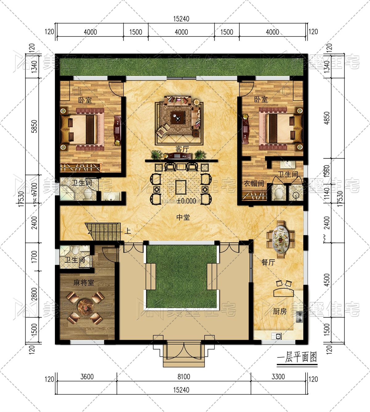 一层设有餐厅、厨房、麻将室、卧室、卫生间、衣帽间、中堂