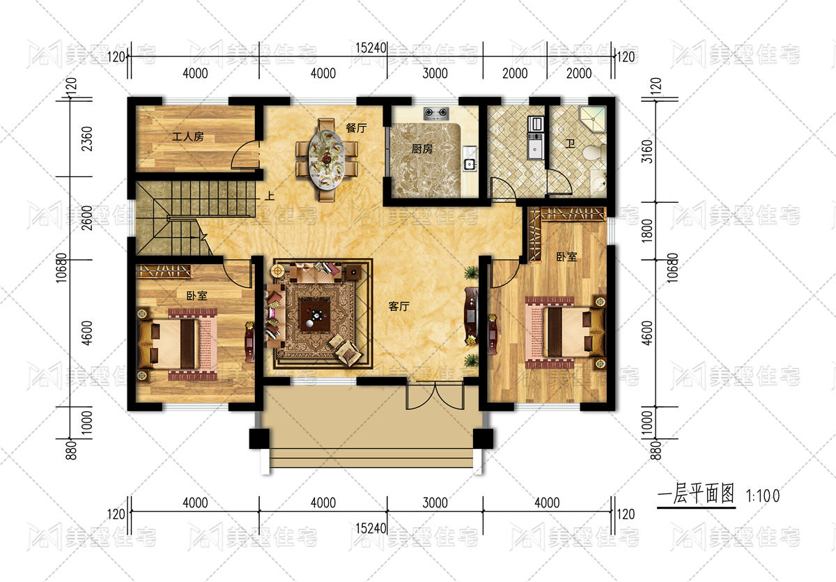 一层设有客厅、餐厅、卫生间、卧室、厨房、洗衣房、工人房