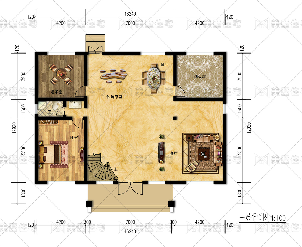 一层设有客厅、休闲茶室、餐厅、烤火房、娱乐室、卧室、卫生间